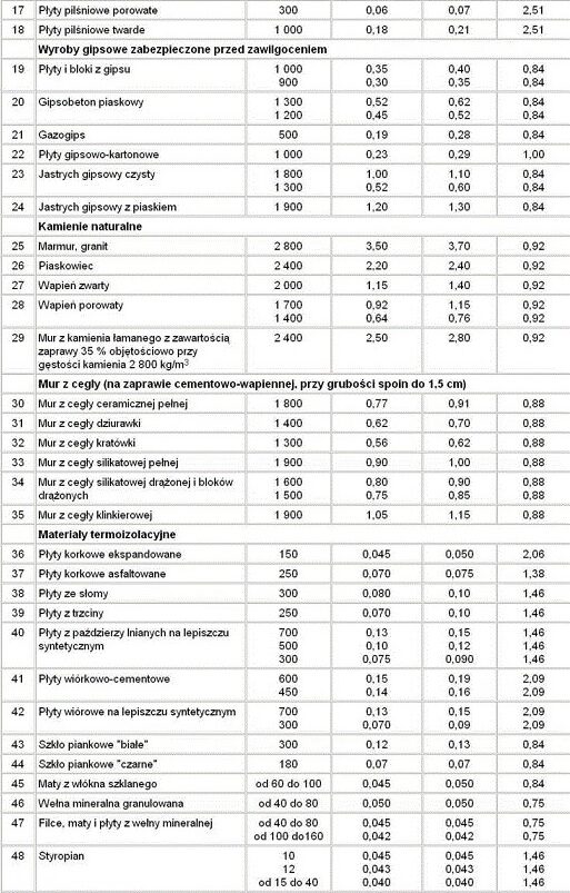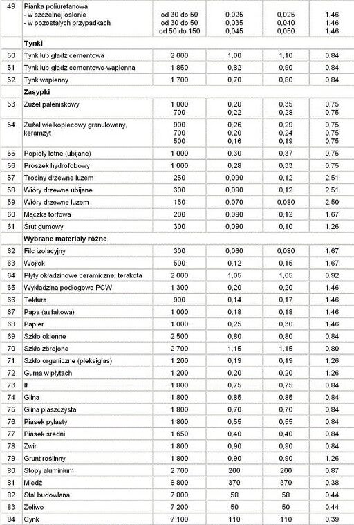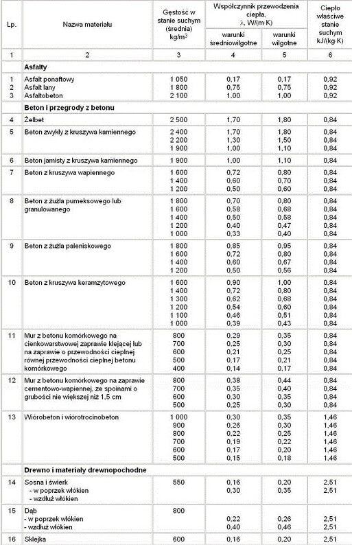λ – współczynnik przewodzenia ciepła materiału przegrody[W/mK]. Parametr ten jest wyznaczany doświadczalnie. Wartości współczynników przewodzenia ciepła dla konkretnych materiałów możemy znaleźć w tablicy NC.1 w załączniku normy PN – EN ISO 6946 : 2008 „Komponenty budowlane i elementy budynku. Opór cieplny i współczynnik przenikania ciepła”