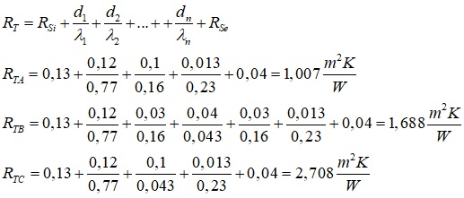 W pierwszej kolejności należy wyznaczyć całkowity opór cieplny i-tej przegrody budowlanej. Opór ten jest sumą oporów RCi poszczególnych warstw przegrody: