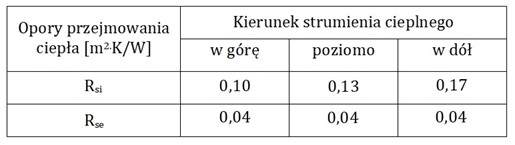 W obliczeniach uwzględnia się również opory przejmowania ciepła Rsi , Rse. Opór przejmowania ciepła jest to opór jaki przechodzącemu ciepłu stawia wewnętrzna i zewnętrzna powierzchnia przegrody. Wartość tego oporu jest zależna od kierunku przepływu strumienia ciepła. Dla przegród płaskich przyjmuje się wartości takie jak w tabeli.