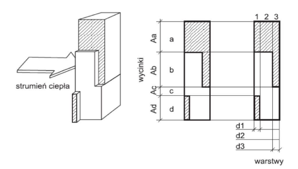Kres górny i dolny należy obliczyć, dzieląc komponent na warstwy (tutaj: 1, 2, 3) oraz na wycinki (tutaj: a, b, c, d) w sposób pokazany na rysunku 1, w taki sposób, aby każda z wydzielonych części była jednorodna cieplnie.