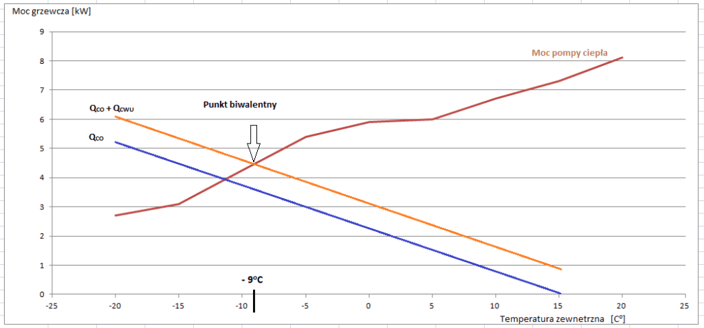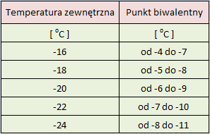 Przecięcie linii brązowej z pomarańczową wyznacza temperaturę punktu biwalentnego. Jest to temperatura przy której wytwarzana przez tą, konkretną pompę ciepła moc jest równa stratom cieplnym budynku. W procesie doboru pompy ciepła dopuszczalny przedział temperatury punktu biwalentnego określa się w zależności od strefy klimatycznej w jakiej posadowiony jest budynek. W poszczególnych strefach klimatycznych określone są konkretne temperatury obliczeniowe. Z poniższej tabeli widać, że dla strefy klimatycznej III, gdzie temperatura obliczeniowa wynosi -20OC, punkt biwalentny powinien zawierać się w przedziale pomiędzy -6OC a -9OC.