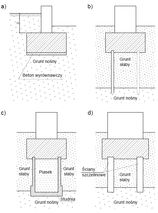 - fundamenty podparte — konstrukcje te charakteryzują się znaczną głębokością posadowiena. Ich zadaniem jest zetknięcie się bezpośrednio z gruntem nośnym, na które muszą zostać przekazane obciążenia budynku. Konstrukcje stosowane w przypadku fundamentów podpartych pośrednich (Rys.1.) to :