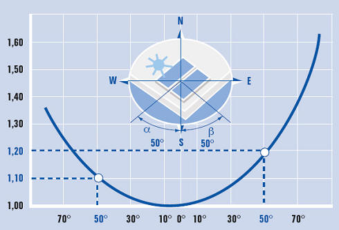 Często usytuowanie kolektora słonecznego jest wymuszone kształtem i nachyleniem połaci dachowej a także usytuowaniem budynku. W związku z tym nie zawsze jest możliwe ustawienie kolektorów w sposób optymalny. W tej sytuacji przy obliczaniu powierzchni kolektorów należy uwzględnić współczynniki zwiększające, które uwzględniają różne kąty nachylenia kolektora oraz odchylenia jego ustawienia od kierunku południowego.